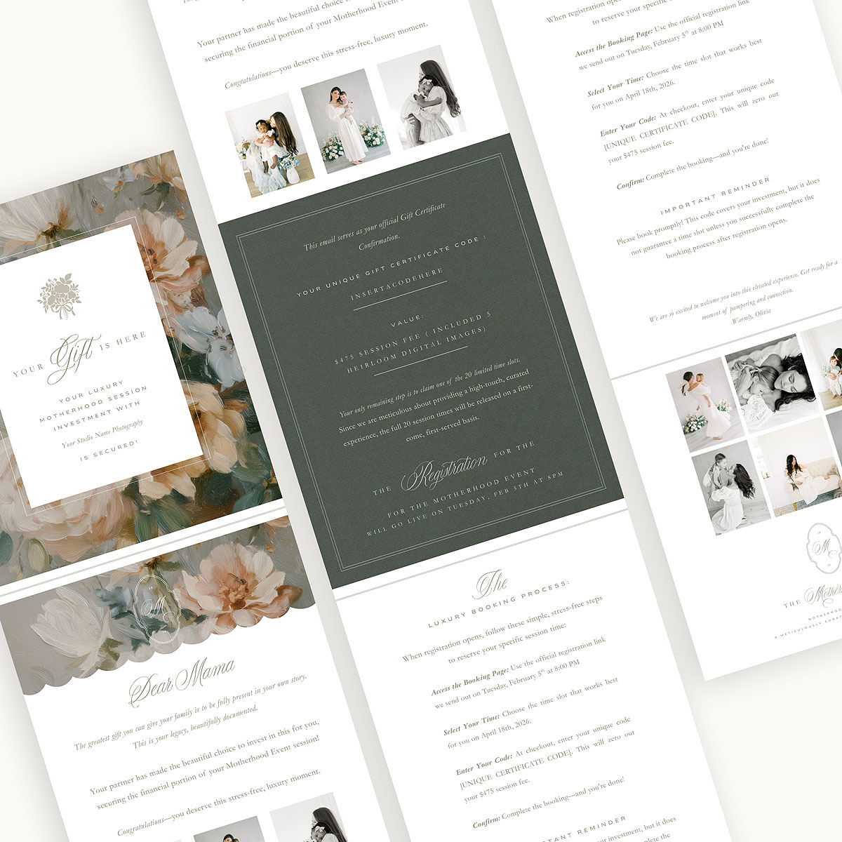 Introducing the Luxury Event Gift Certificate Redemption Template, a photographer’s ultimate tool that helps you deliver a high-end confirmation and booking email for gifted or pre-purchased event sessions, managing a strict timeline while maintaining a seamless, full-service client experience.
